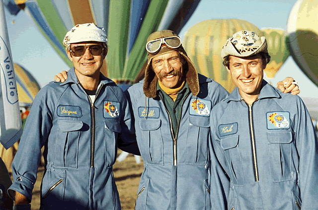 For this first Fiesta of ours, we found an old barnstormer balloonist, Bill Douglas (left, middle), who agreed to teach us how to fly. In return, he got to fly our big, new balloon at that first fiesta. As you can see, we came up with silly uniforms for that first event. They were so impractical that we ended up abandoning them and going with white jeans, blue shirts, red belts and a white jacket with the images of the balloons we owned embroidered on the back.