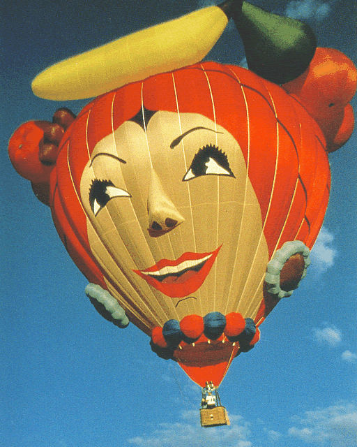 Jacques learned how to fly and then we moved to England so I could study at the Webber-Douglas Academy of Dramatic Art, and we took advantage of being there by buying and flying more balloons. Our first special shaped balloon, Chic-I-Boom, was the likeness of the head of Carmen Miranda (left), and she was quite a hit. In fact, she was Albuquerque’s first special shape, and appeared at most Fiestas for years. Since she was a normal balloon with ‘bits’ added, she wasn’t really a special shape, but at the time, the only other person flying fleets of special shaped balloons was Malcolm Forbes, so we felt we were in good company. She, and most of our later balloons, were built by Cameron Balloons in Bristol, UK. We became close friends of the builder, Don Cameron, and his family.